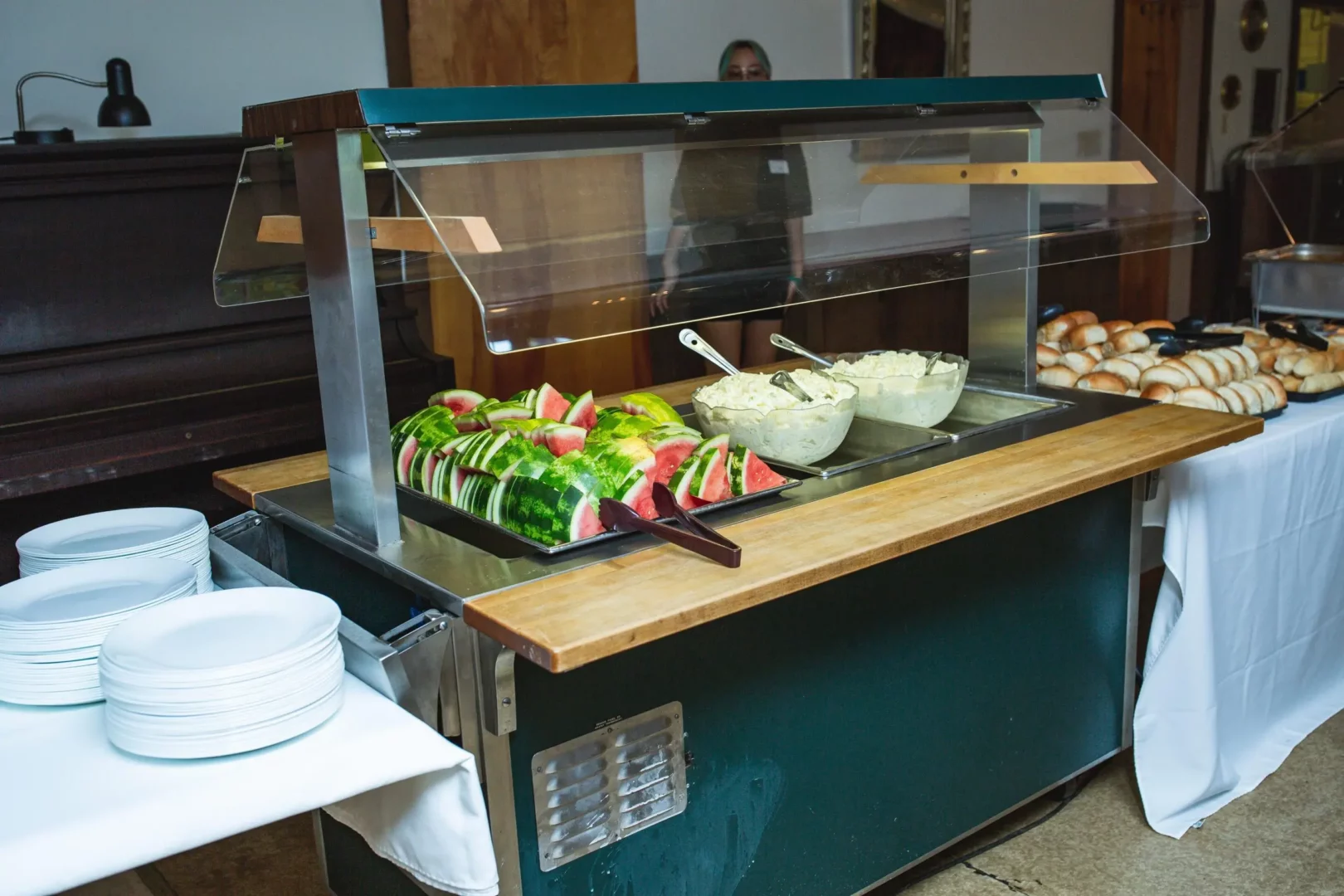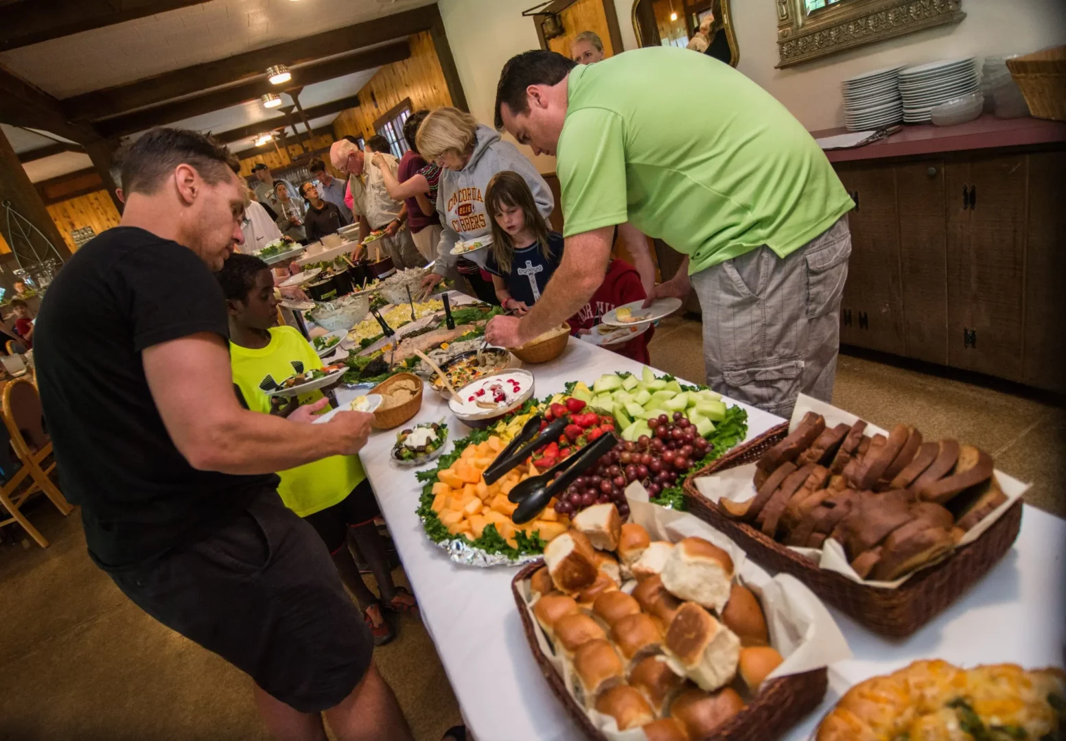 Lunch is a lighter fare. It features a salad bar stocked with all the fixings, a vegetarian hot entrée and vegetarian soup. A kids bar with a different kid-friendly item at each meal, ready to serve the second the kids enter the building hungry! The main entrees are served buffet style featuring a hot and cold option, delicious sides and homemade desserts. A variety of beverages accompany the meal.