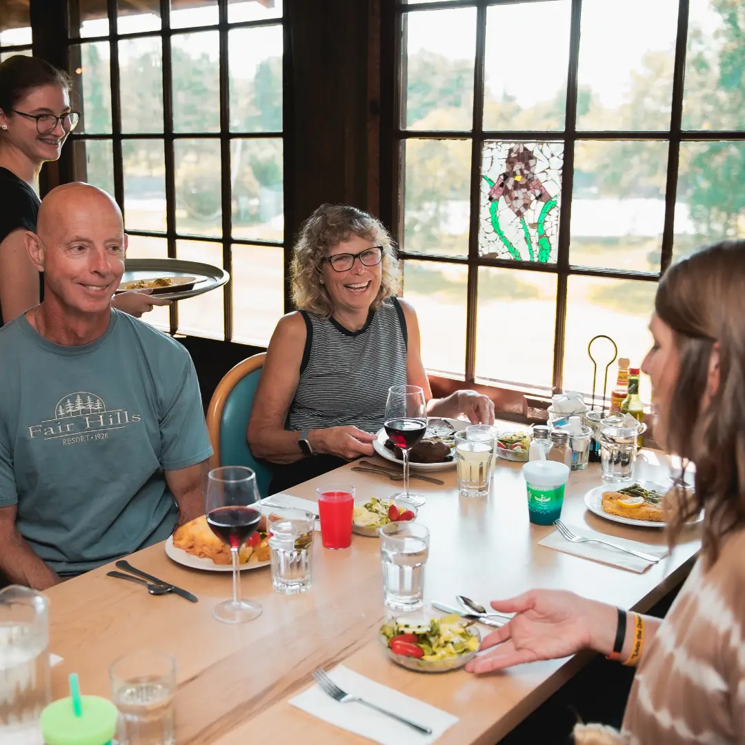 Fair Hills has found that a family sharing a good meal together is a prime ingredient for a happier vacation. During our all All Inclusive Vacation Season, Fair Hills serves three meals daily to its guests. A bell rings to signal the beginning of the meal hour. The Fair Hills kitchen can accommodate most dietary restrictions with advance notice. We offer vegetarian, gluten free and dairy free choices at every meal. Beer and wine are offered for purchase at our bar during dinner.