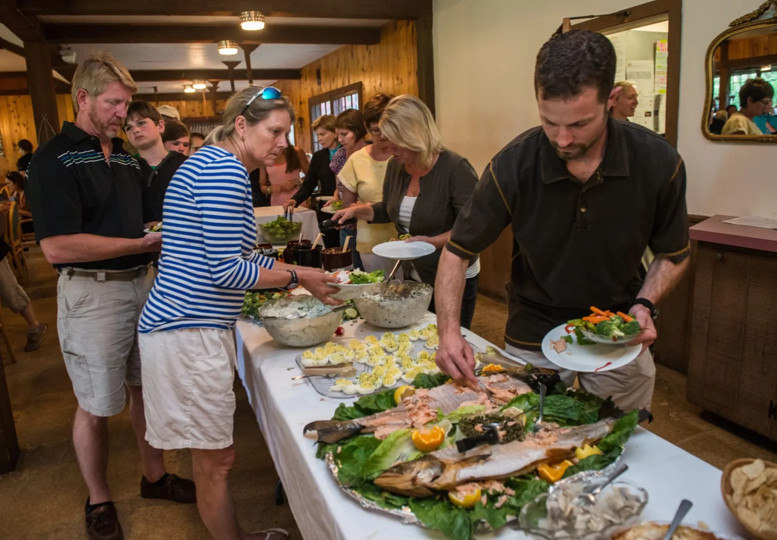 While most of our dinners served in the Dining Room are “order off the menu,” on Tuesday Nights in the middle of the summer, we serve our famous Smorgasbord Buffet. Served from 5:30pm – 7:00pm, this dinner is the also open to the public and precedes the Hootenanny Show. We offer a bar open during dinner serving beer, wine and pop for purchase.